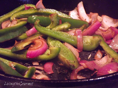 In the pan that the chicken was sautéed in place the sliced onions and peppers. Drizzle, a little olive oil over the veggies and toss. Sauté until the veggies are softened and slightly charred.