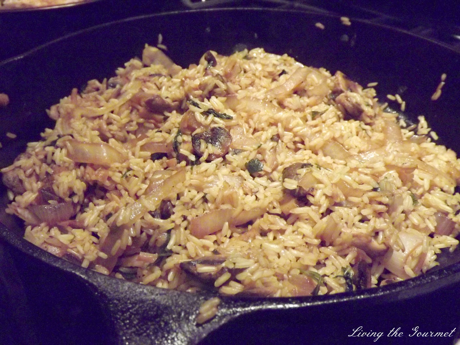 Heat a large frying pan with a drizzle of olive oil and add the marinated mushroom mixture. Sauté until fragrant, add the rice and continue to sauté for a minute or two.