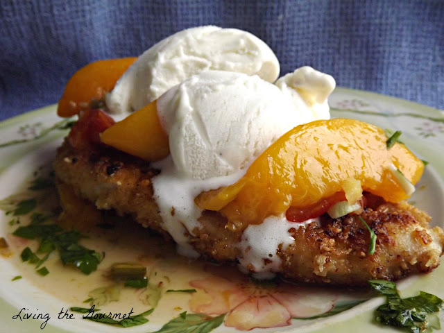 - Plate the cutlet and top with the peach sauce. Finish the cutlet with a scoop or two of vanilla ice cream and a parsley garnish.