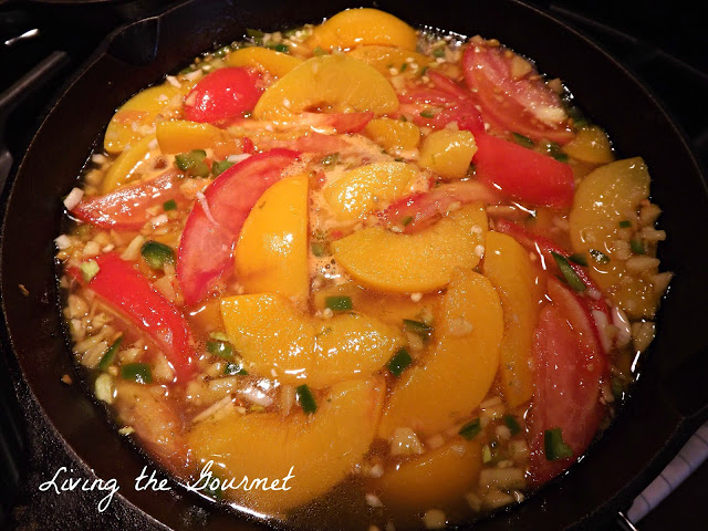 Prepare the Sweet and Spicy Sauce firstHeat a large 10-inch cast iron frying pan with the olive oil. Over medium heat add the sliced tomato, chopped ginger and the chopped jalapeño. Sauté over medium heat for a minute or two.