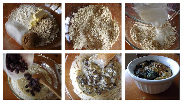 - In a medium bowl, combine the flour, oats, sugar, baking powder, baking soda, and salt. Using a pastry blender or the back of a fork, bled the cold margarine until it resembles a coarse meal. IN a small bowl, combine the lemon zest, lemon juice, and milk, then add the liquid to the dry meal and mix until just combined. Add blueberries and gently combine.