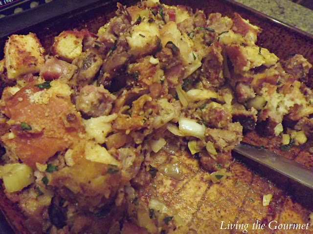 Sauté the celery, onions, garlic and parsley until the onions are soft and the garlic fragrant. Add the chopped sausage and the cubed Italian bread and crumbled saltine crackers and cheese.