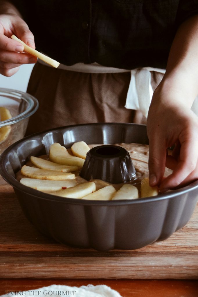 - Pour the batter into the prepared bundt pan then top it off with the remaining apple slices. Bake for 35-40 minutes or until the cake tester comes out clean.